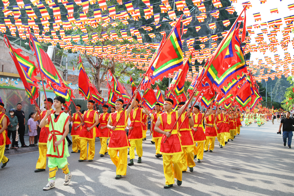 Процессионные отряды в традиционных костюмах участвуют в церемонии процессии на Фестивале храма Дык Онг...