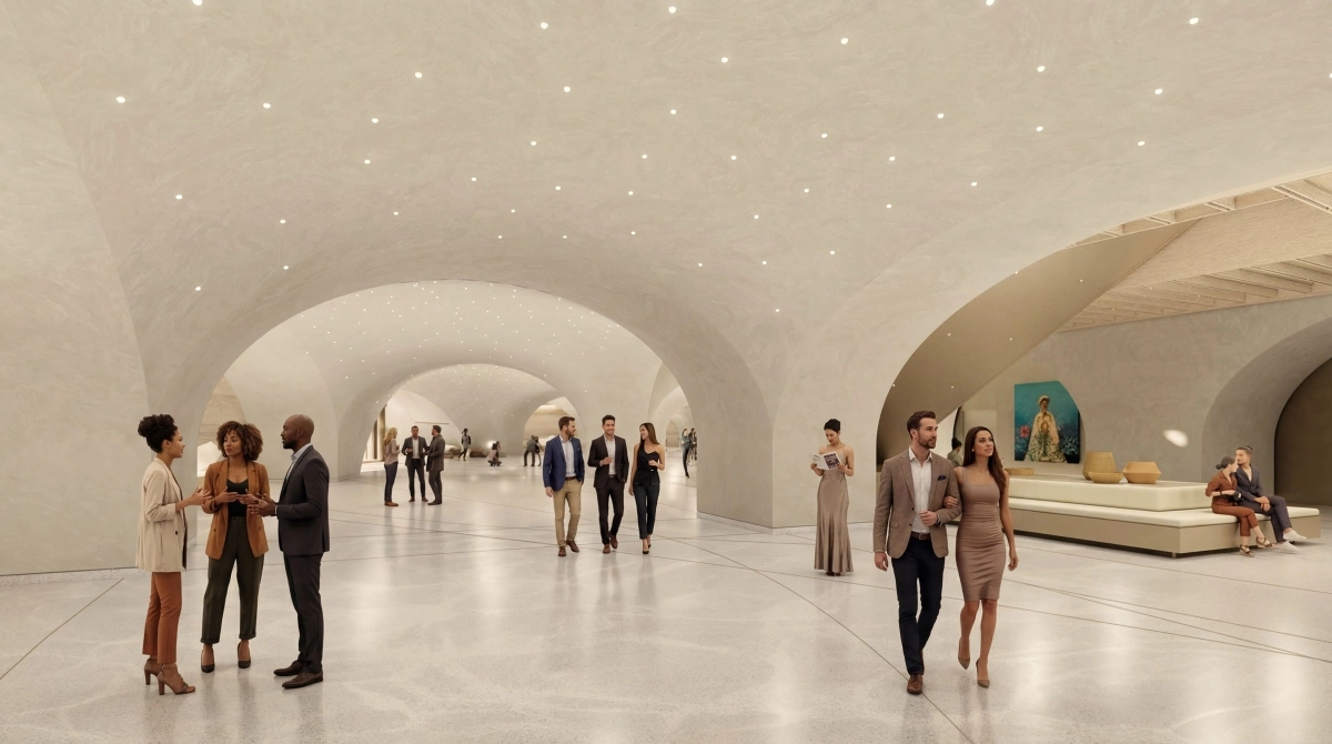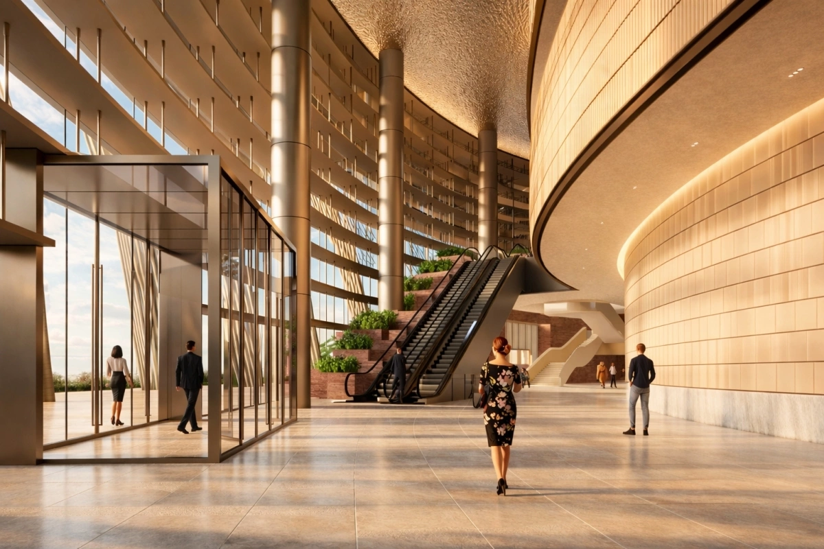 Второй этаж спроектирован с открытыми пространствами и естественным освещением, создавая переходную зону перед входом в главный зал. Зелень из окружающей среды интегрирована в этот уровень, чтобы создать более расслабленную атмосферу.