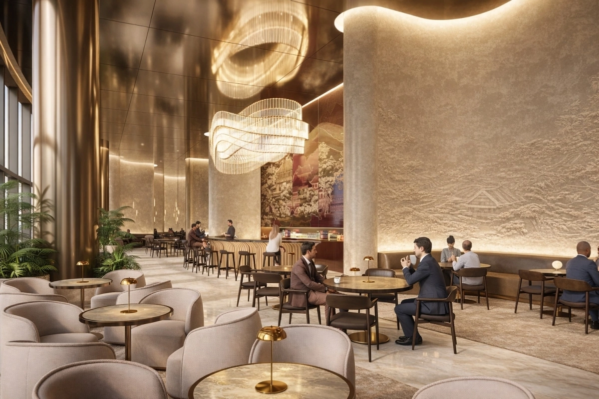 Такие элементы дизайна, как многослойные потолки, вдохновленные традиционными черепичными крышами, и узоры на стенах, напоминающие чешуйки дракона, интерпретированы с помощью современного архитектурного языка.
