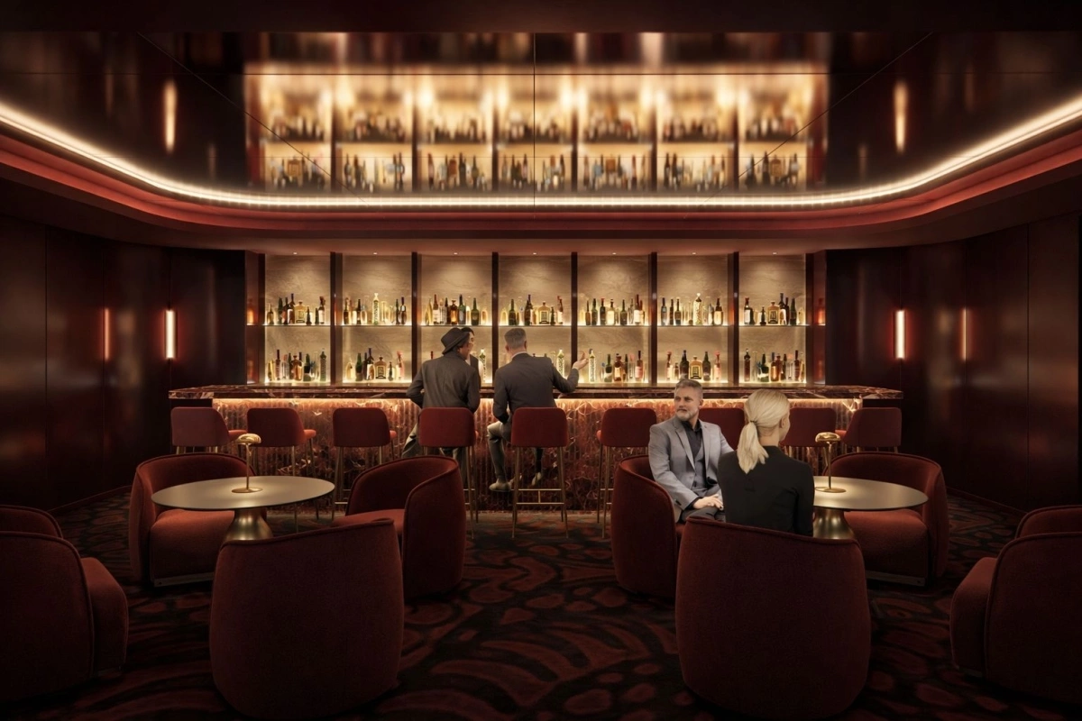 Дополнительные удобства включают зал VVIP, созданный для обеспечения приватной и эксклюзивной атмосферы. Интерьер отличается сочетанием насыщенных красных оттенков, теплого освещения и тщательно подобранных материалов, таких как бархат, металл и камень. Расположение сидений обеспечивает уединение, сохраняя при этом общую гармонию пространства.